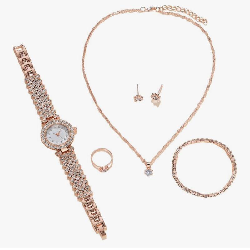 Sets Gifts for Women Diamond Bangle Necklace Earrings Ring Watches 5 Pack Dress Jewelry Watch for Female