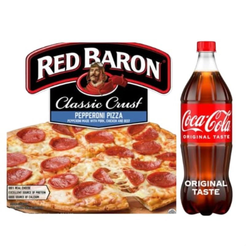 Pepperoni Classic Crust Frozen Pizza with big coke.Β